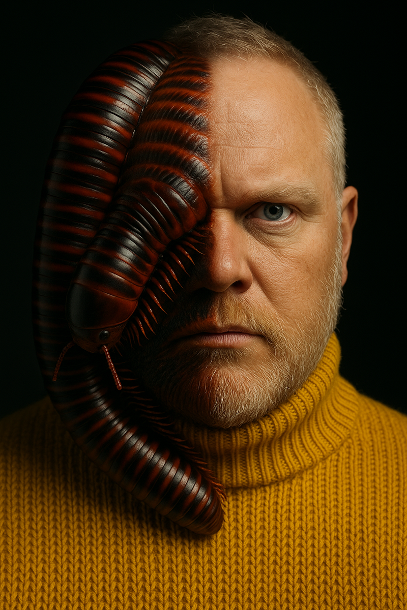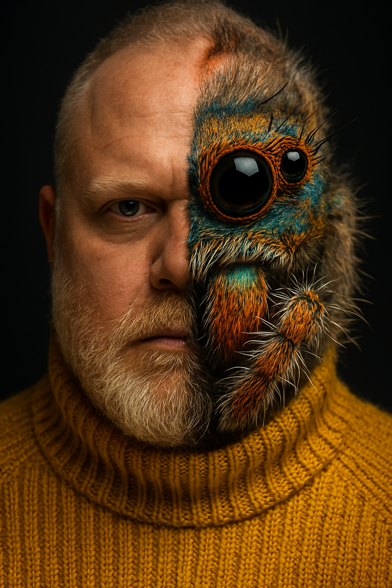 Ich verschmelze dabei mit einer biologischen Linie, die älter ist als jede Kultur. Insekten und Spinnentiere erscheinen hier nicht als bloße Motive, sondern als Wesen von fremdartiger Schönheit und funktionaler Präzision. Eine Spezies, die nie existierte, aber existieren könnte, wenn Evolution, Imagination und Bewusstsein ineinandergreifen.